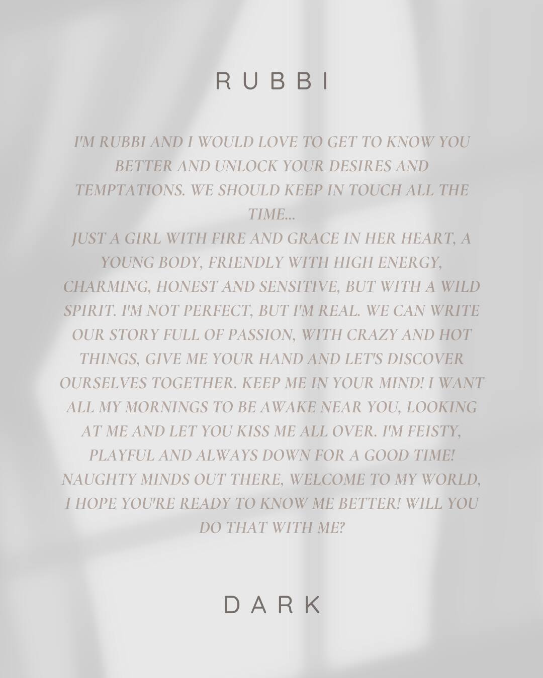 I'm Rubbi and I would love to get to know you better and unlock your desires and temptations. We should keep in touch all the time...